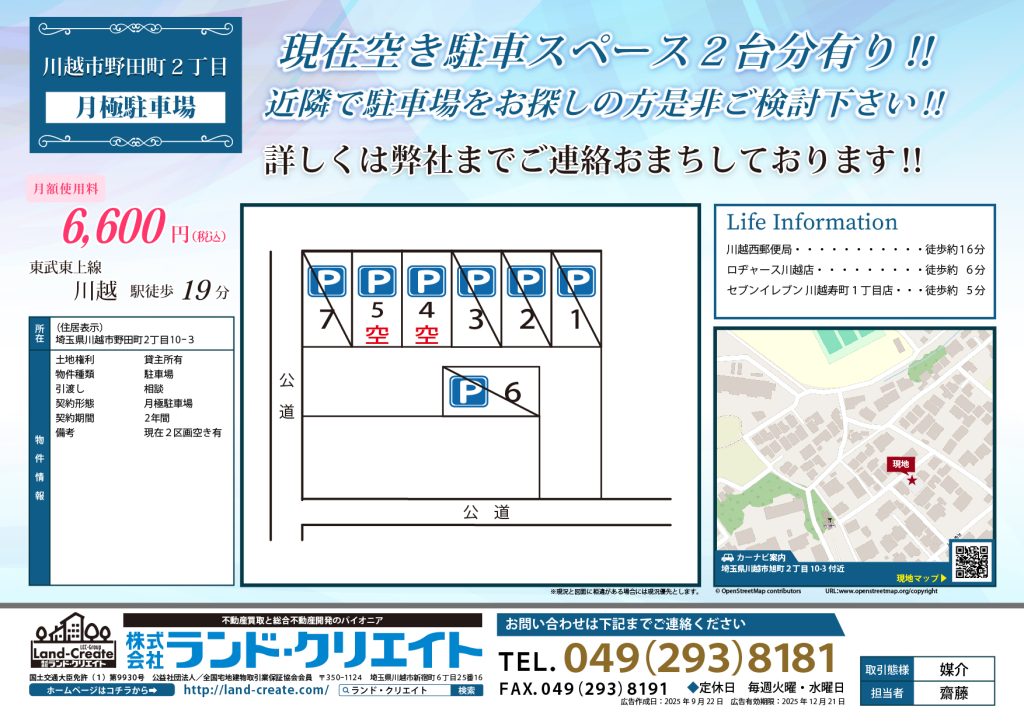 野田町月極駐車場★現在空き2台有り★ 賃料 6,600円 駐車場 所在地 埼玉県川越市 野田町2-10-3 交通 東武東上線 川越駅 徒歩19分 面積 駐車場 物件番号 100136068222 設備・条件 物件の詳細を見る