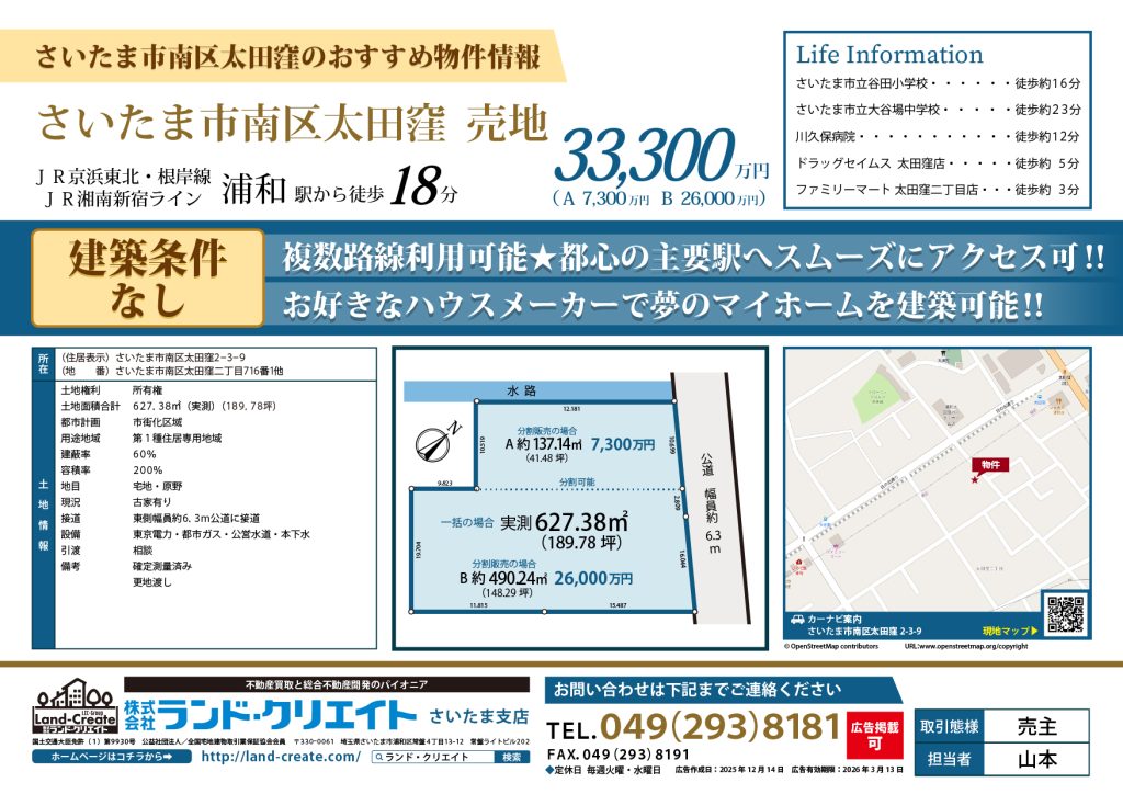 建築条件無し★さいたま市南区太田窪 売地up 価格 3億3,300万円 売地 所在地 埼玉県さいたま市南区 大字太田窪2-3-9 交通 JR京浜東北・根岸線 浦和駅 徒歩18分 面積 土地 627.38m² 建蔽率/容積率 60% / 200% 区画番号 現況 上物有 物件番号 100133227452 設備・条件 建築条件無 都市ガス 公営水道 物件の詳細を見る