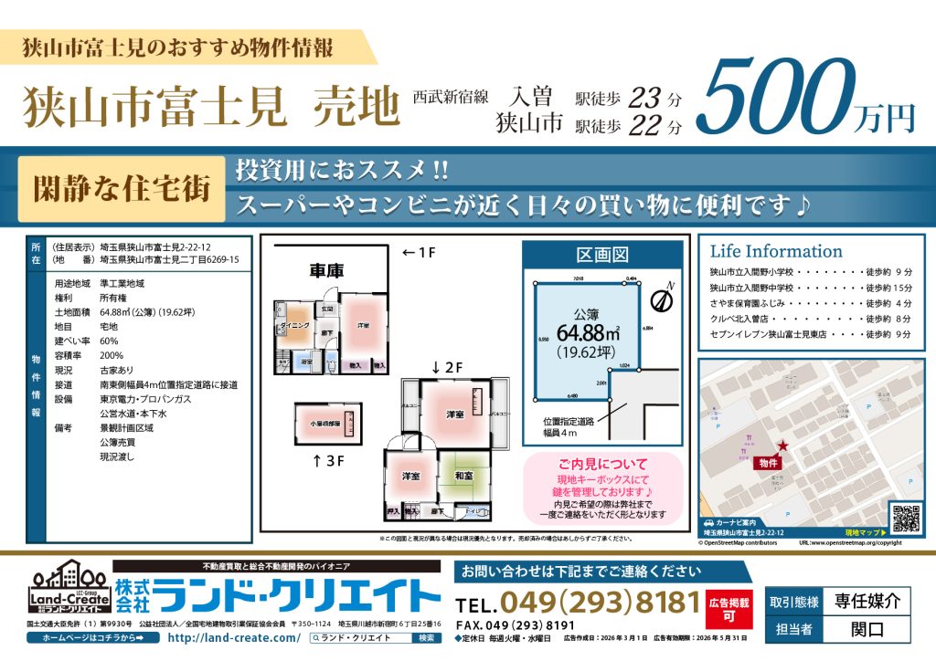 閑静な住宅街★狭山市富士見 売地 画像1 マイソク図面